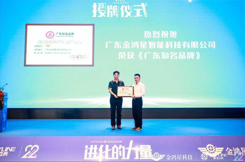 金鸿星凭借独特的品牌理念和强大的企业实力与客户认知度等综合实力,荣获“广东知名品牌”,品牌强国先行工程组委会秘书长、广东省企业品牌建设促进会常务会长兼秘书长、品牌中国战略规划院广东研究中心主任王满平先生现场为金鸿星颁发荣誉。王满平会长表示:在数字经济新时代,金鸿星科技始终保持敏锐的市场洞察力,注重技术研发和创新,以推动产品升级和转型,背后是对产品质量和服务质量的严格把控和不懈追求。