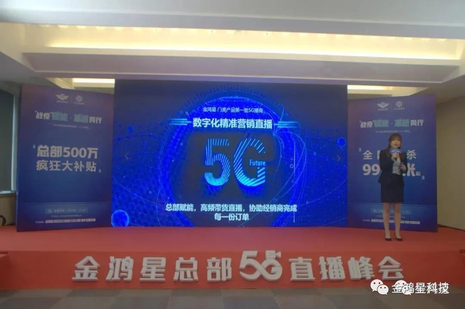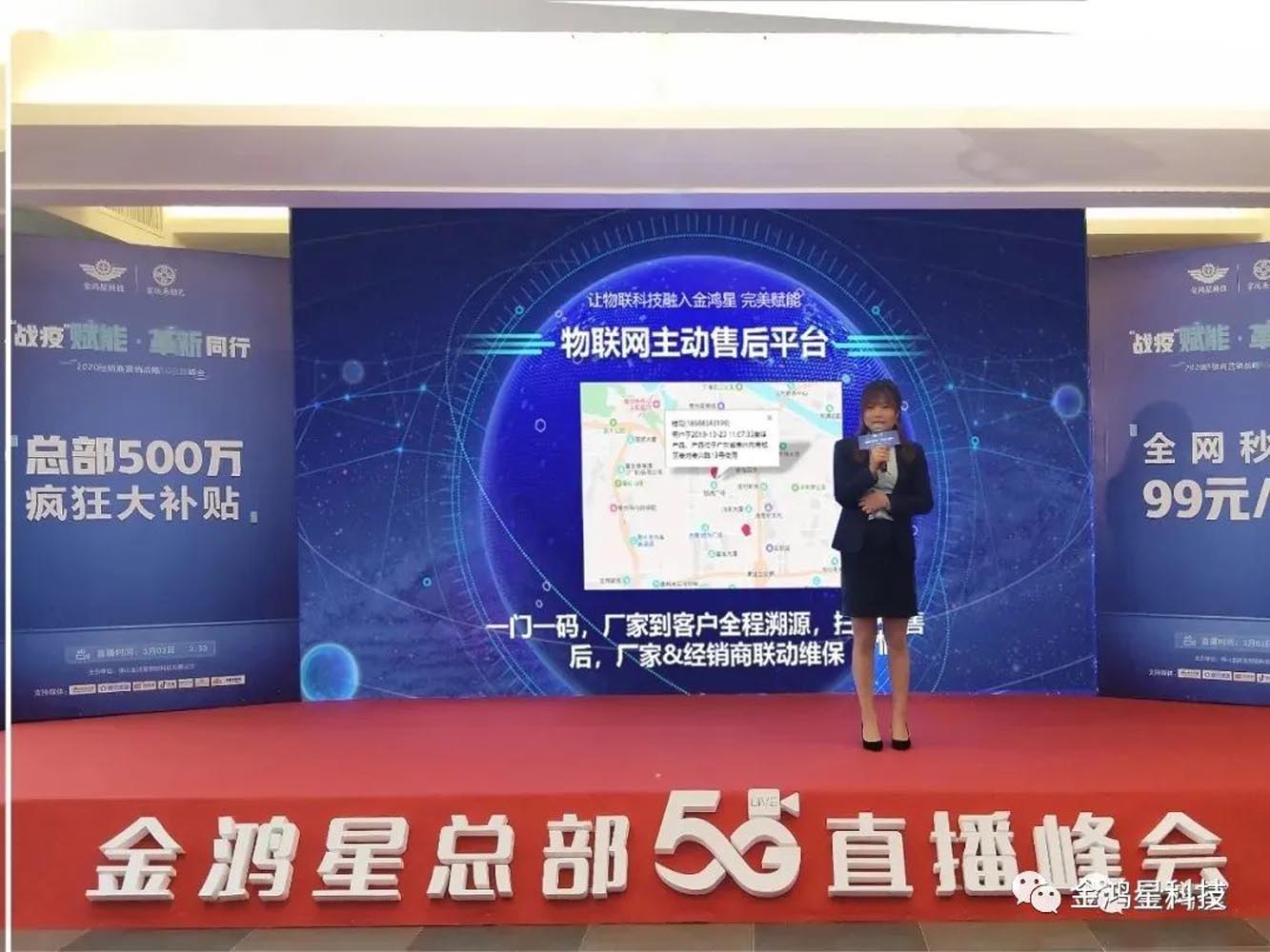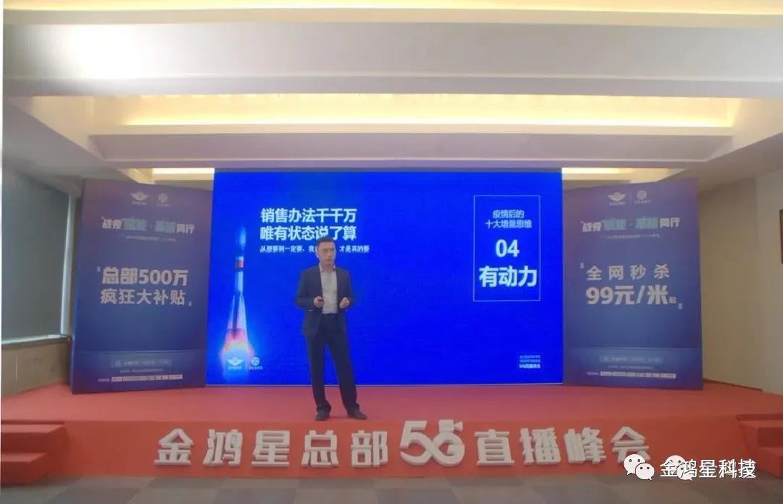本次营销战略峰会5G直播就是金鸿星数字化营销平台的一个组成部分,金鸿星数字化营销平台将在今年全面上线,平台将借助云计算、5G+物联网技术在产品营销推广、引流、成交、售后服务等方面全方位为经销商持续赋能。