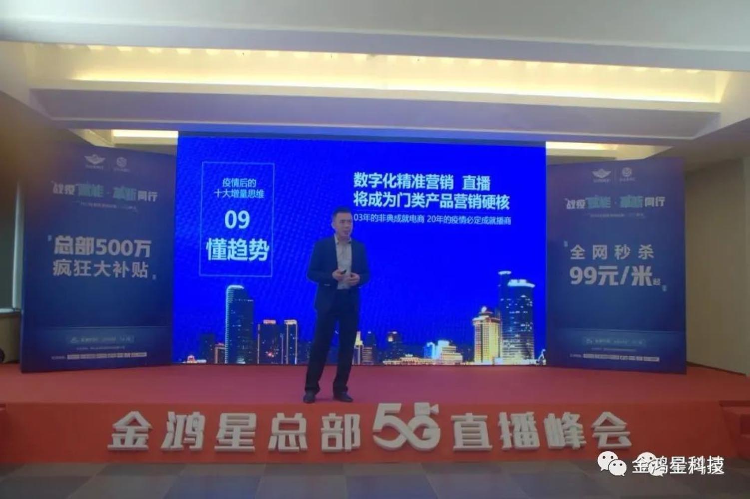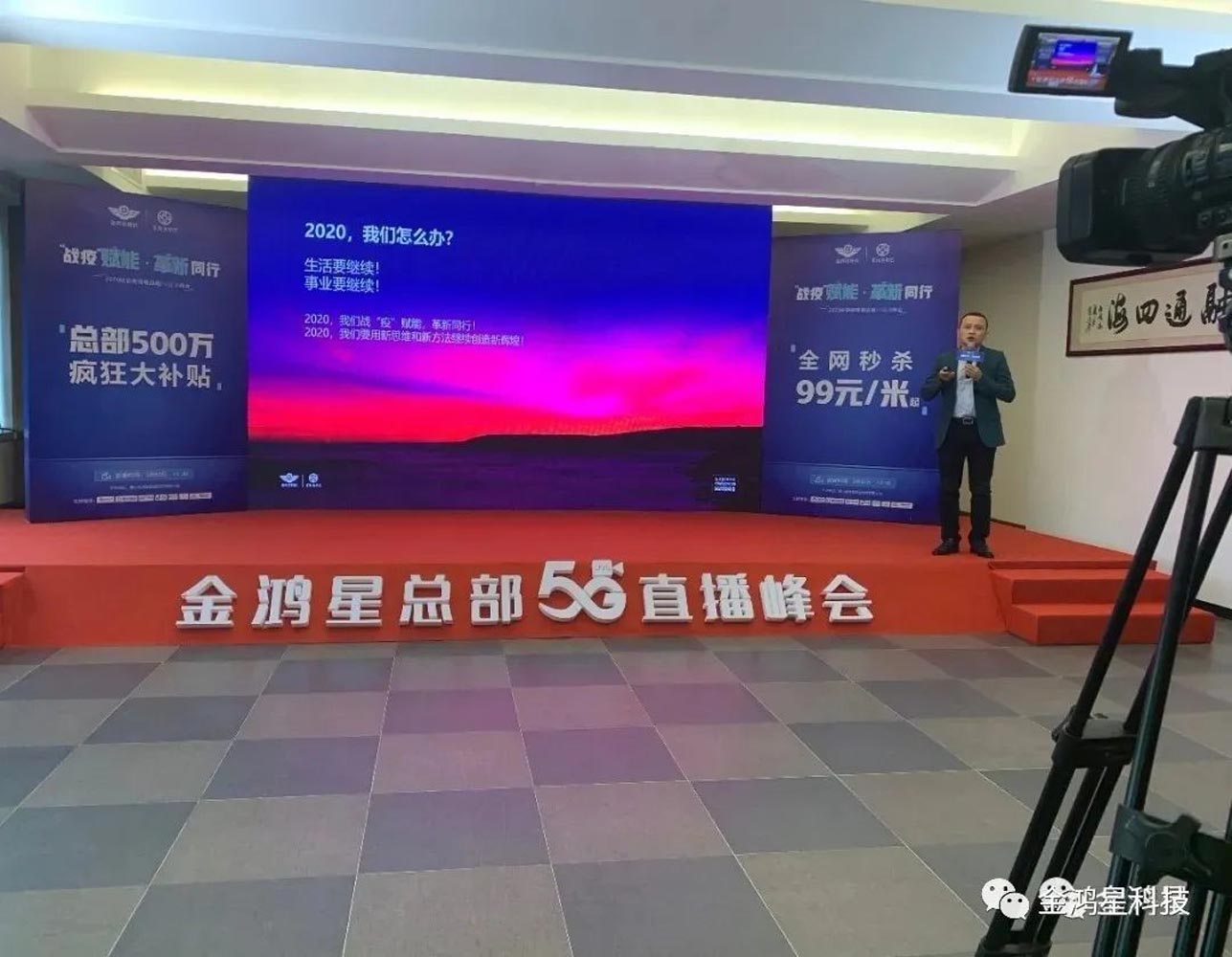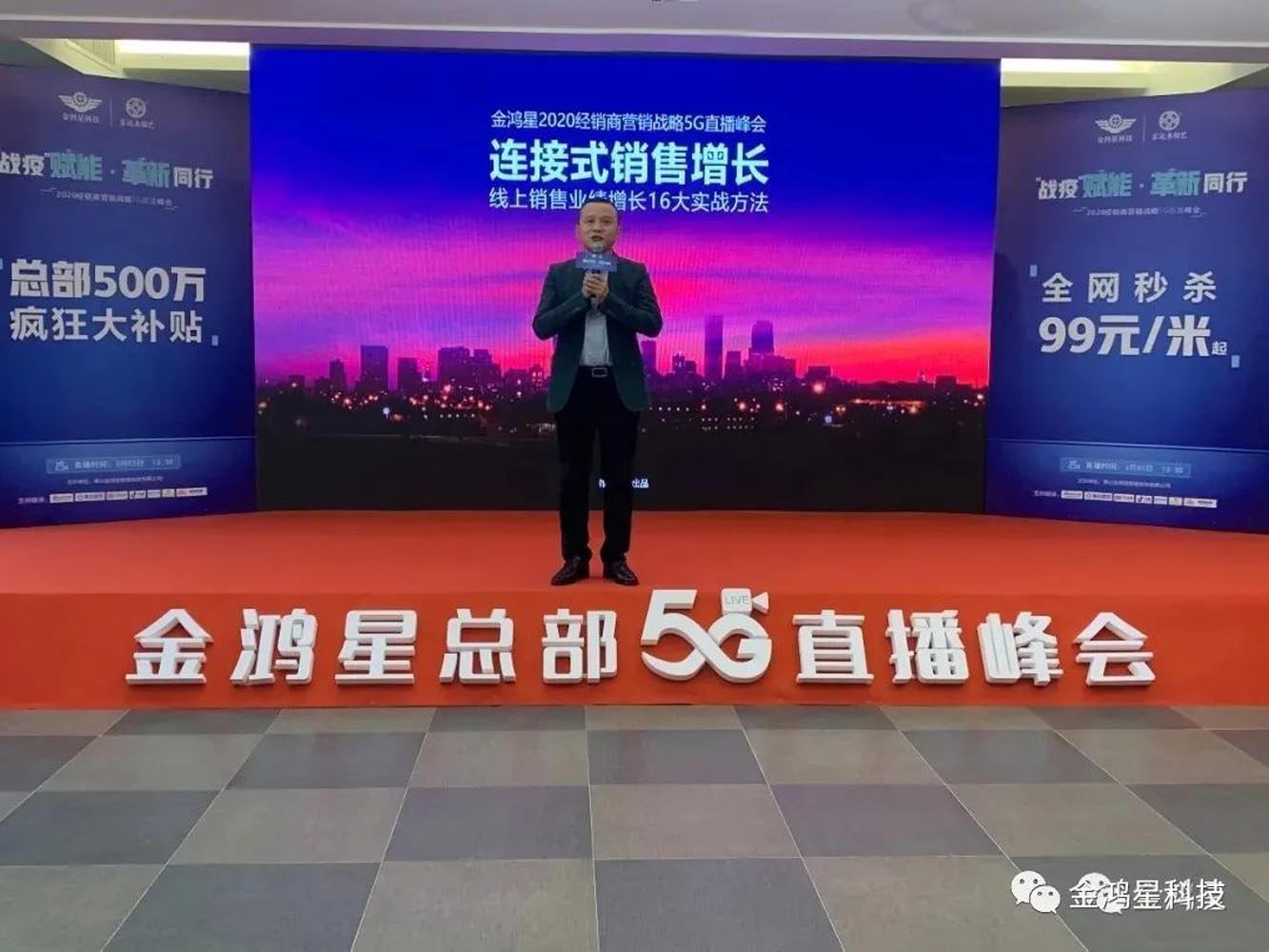 本次营销战略峰会5G直播就是金鸿星数字化营销平台的一个组成部分,金鸿星数字化营销平台将在今年全面上线,平台将借助云计算、5G+物联网技术在产品营销推广、引流、成交、售后服务等方面全方位为经销商持续赋能。