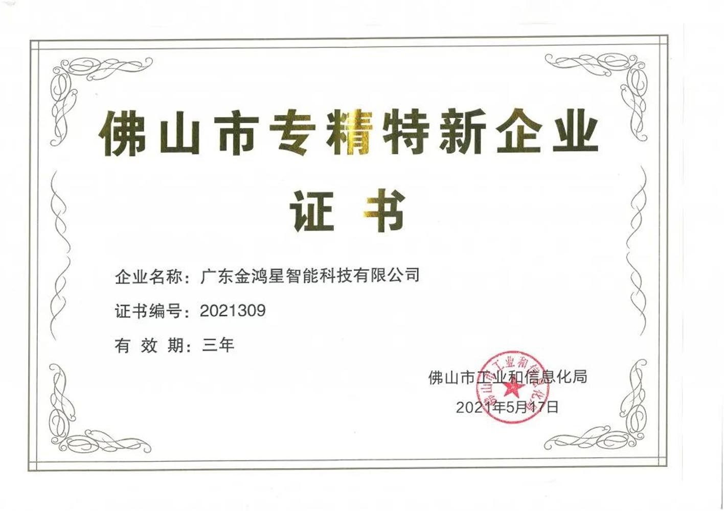 2021年5月26日,金鸿星智能科技有限公司荣获佛山市工业和信息化局颁发的“专精特新”企业荣誉证书。这是上级政府部门对金鸿星科技在市场经营管理以及产品科技创新等方面实力的再次肯定。